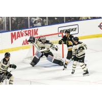 Utah Grizzlies' Cole Gallant and Allen Americans' Andrew Jarvis and Spencer Asuchak on game night