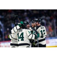 Utah Grizzlies' Mick Messner celebrates with teammates