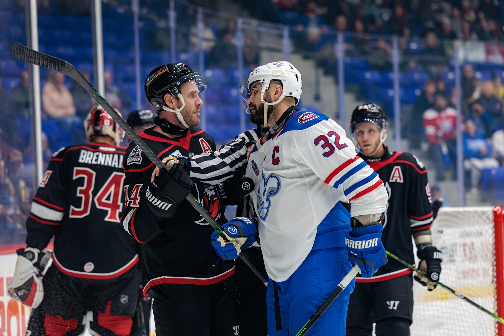 Adirondack Thunder defenseman Jacob Graves (left) vs. the Trois-Rivieres Lions