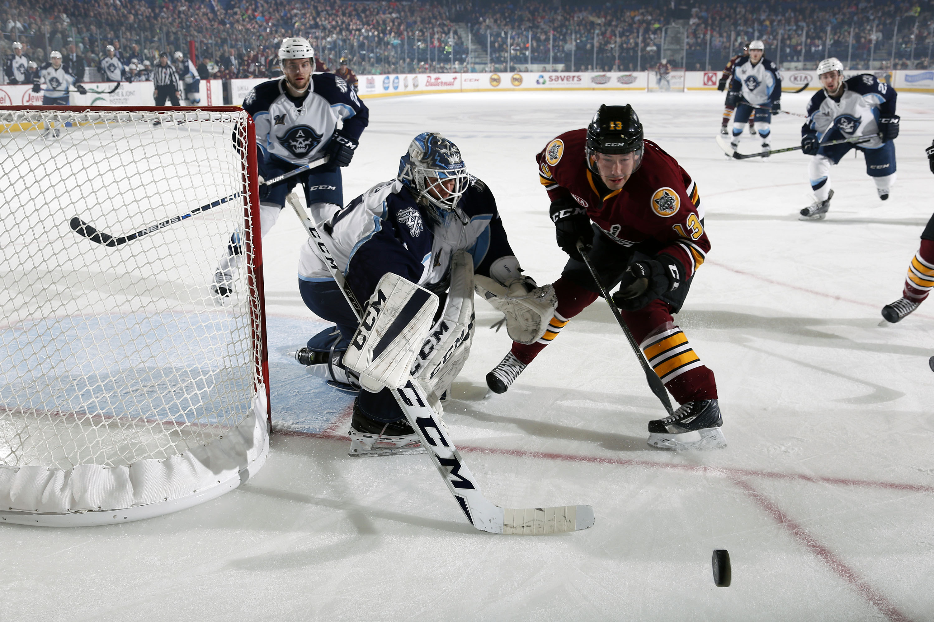 Chicago Wolves F Evan Trupp Eyes a Loose Puck vs. the Milwaukee Admirals