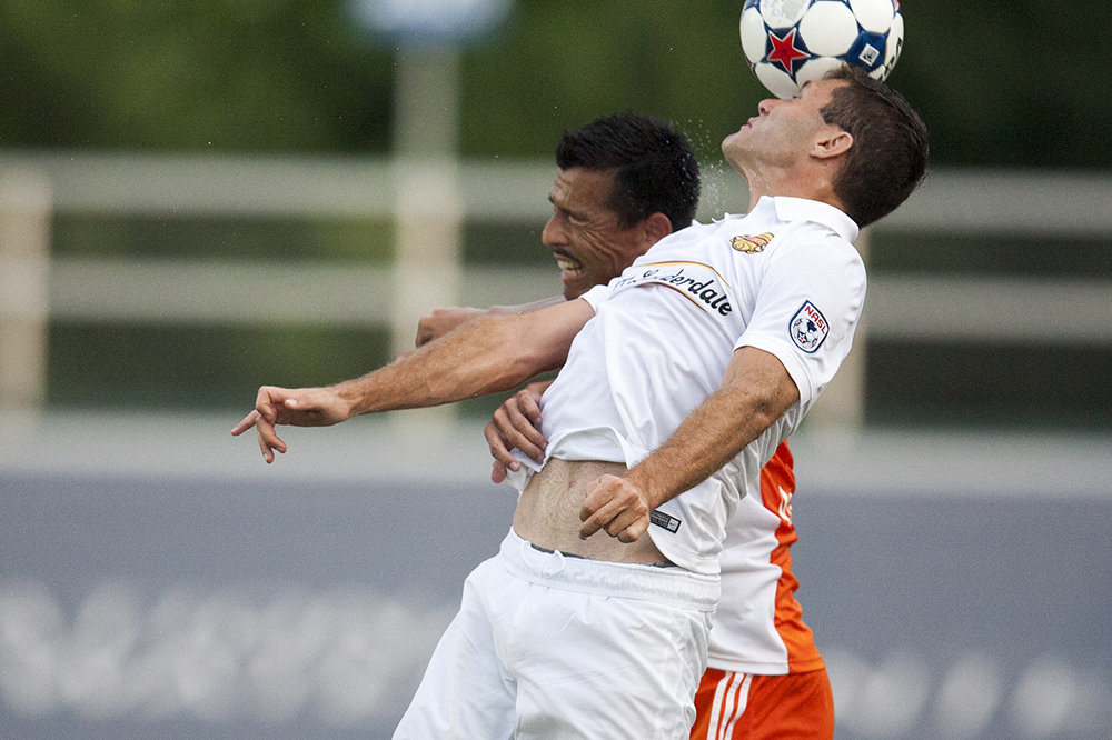 Fort Lauderdale Strikers defender Frankie Sanfilippo challenges Carolina RailHawks' defender for an aerial ball in the Strikers' 1-1 draw Wednesday night at WakeMed Soccer Park.