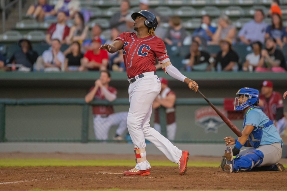 Gabby Guerrero hits his second home run of the season to tie to game at five as the Kansas City Monarchs faced the Sioux Falls Canaries Friday May 27, 2022 at Legends Field in Kansas City, Kansas.