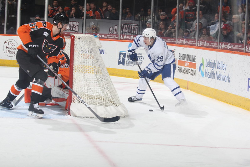 Lehigh Valley, PA - Reigning American Hockey League Rookie of the Month, Elliot Desnoyers reached the 20-goal milestone, and Artem Anisimov (16th), Garrett Wilson (11th) and Olle Lycksell (10th) all struck to lead the Lehigh Valley Phantoms past the North Division-best Toronto Marlies by a 4-3 count on Saturday night at PPL Center.
