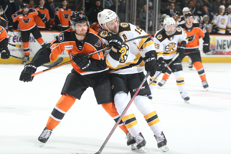 Lehigh Valley Phantoms defenseman Cam York (left) vs. the Providence Bruins