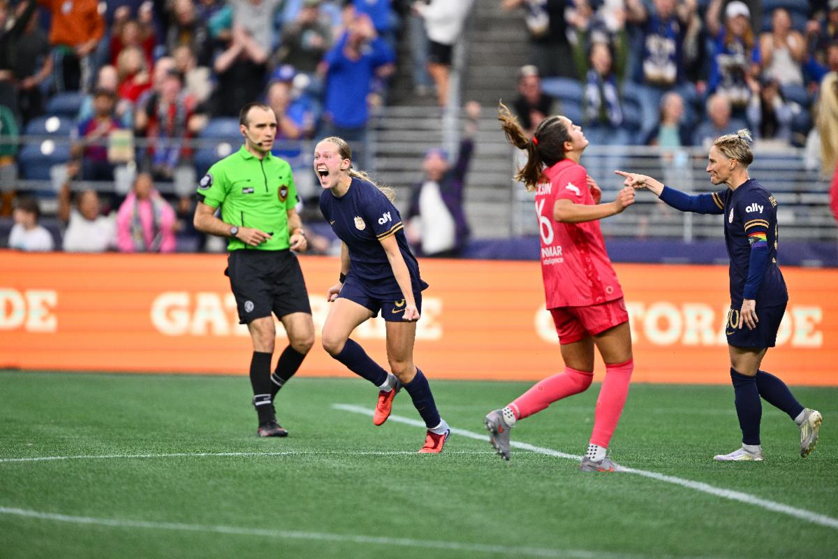 Maddie Dahlien of Seattle Reign FC reacts after her game-winning goal