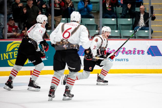 Prince George Cougars centre Connor Bowie celebrates a goal