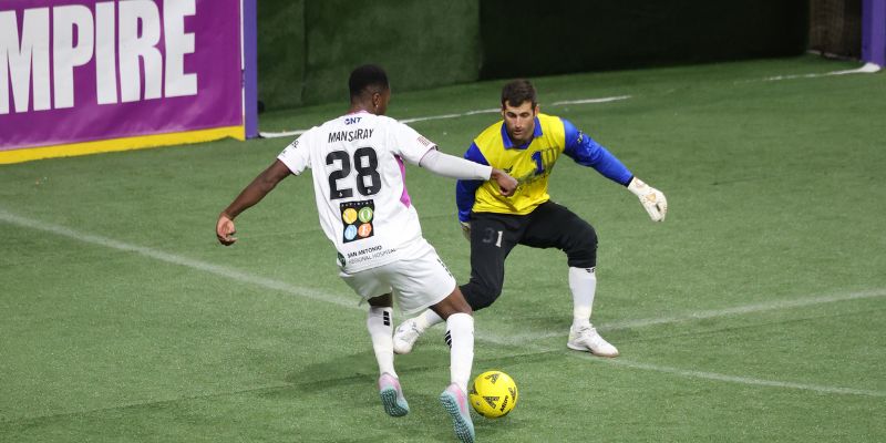 San Diego Sockers goalkeeper Chris Toth prepares to Stop an Empire Strykers shot
