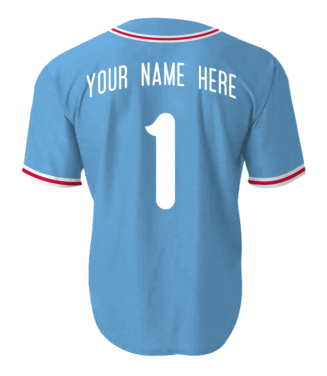 The jerseys feature a powder blue base with a red and white trim on the middle piping...