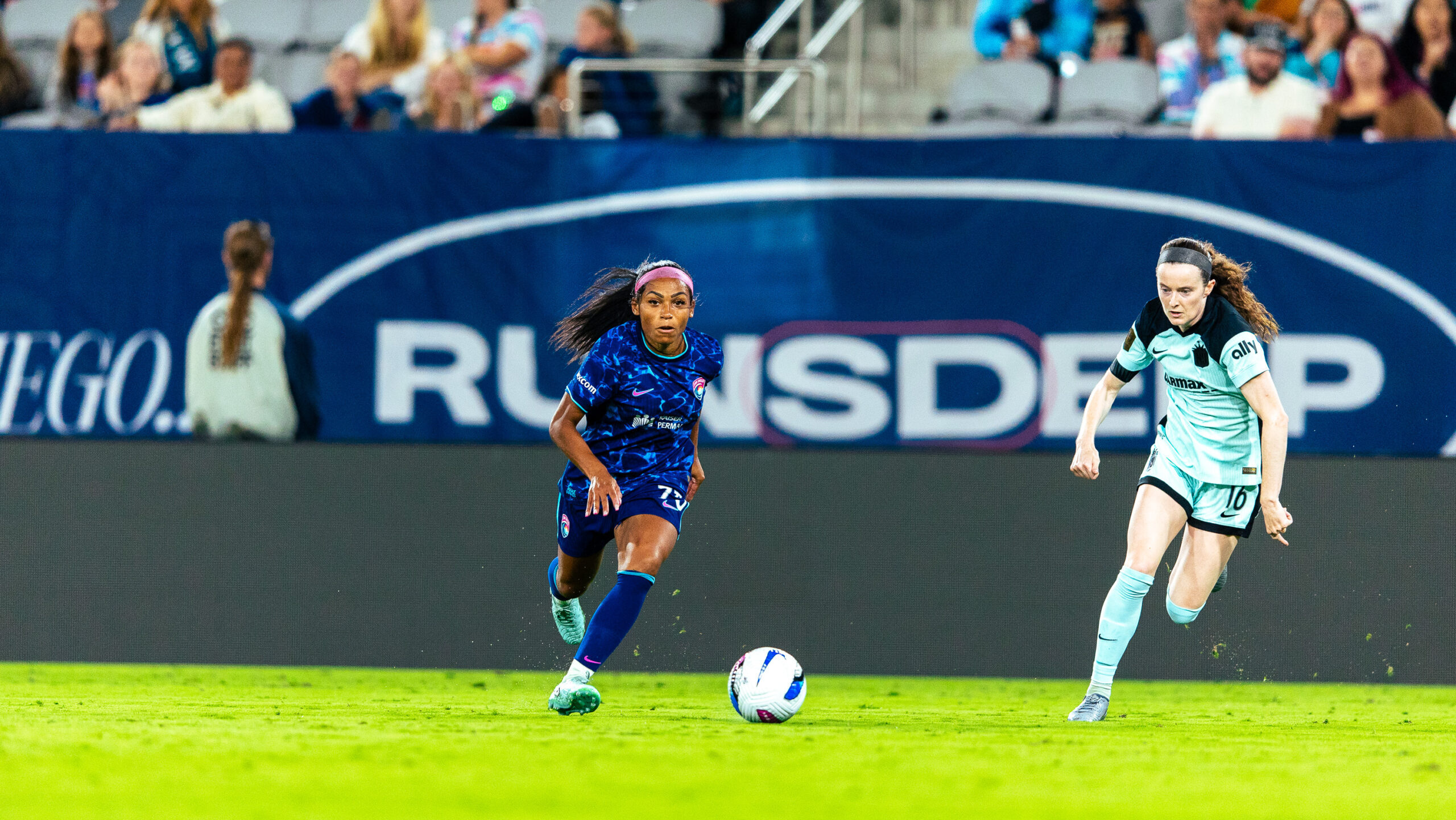 San Diego Wave FC's Perle Morroni and Gotham FC's Rose Lavelle on the field