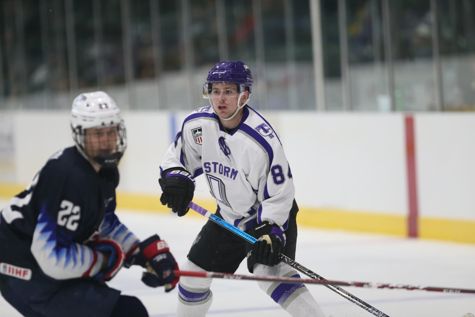 Tri-City Storm defenseman Mike Koster (right)