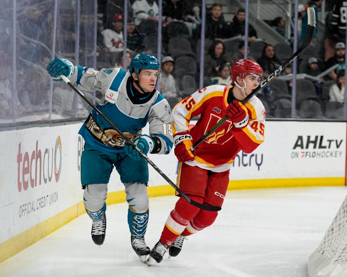 San Jose struck first just 1:33 into the opening period when Braden Hache (1) snapped home his first of the season, ending a 40-game goalless drought. But Calgary answered quickly as Sam Morton (8) scored just a minute and nine seconds later off a Barracuda turnover.