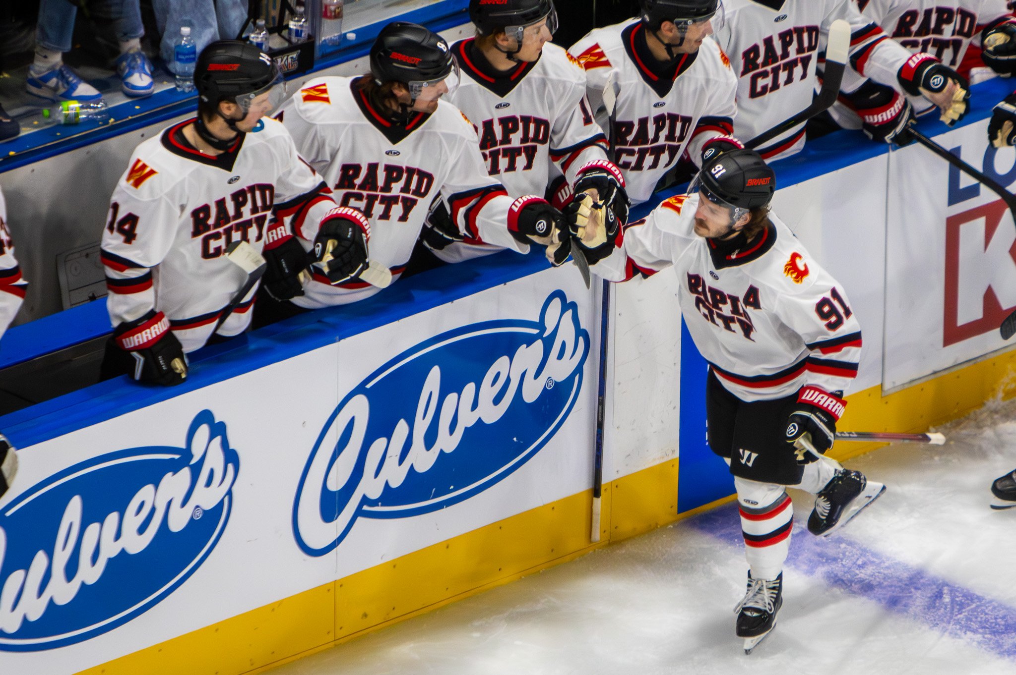 ![]() Rapid City Rush forward Blake Bennett received congratulations along the bench |