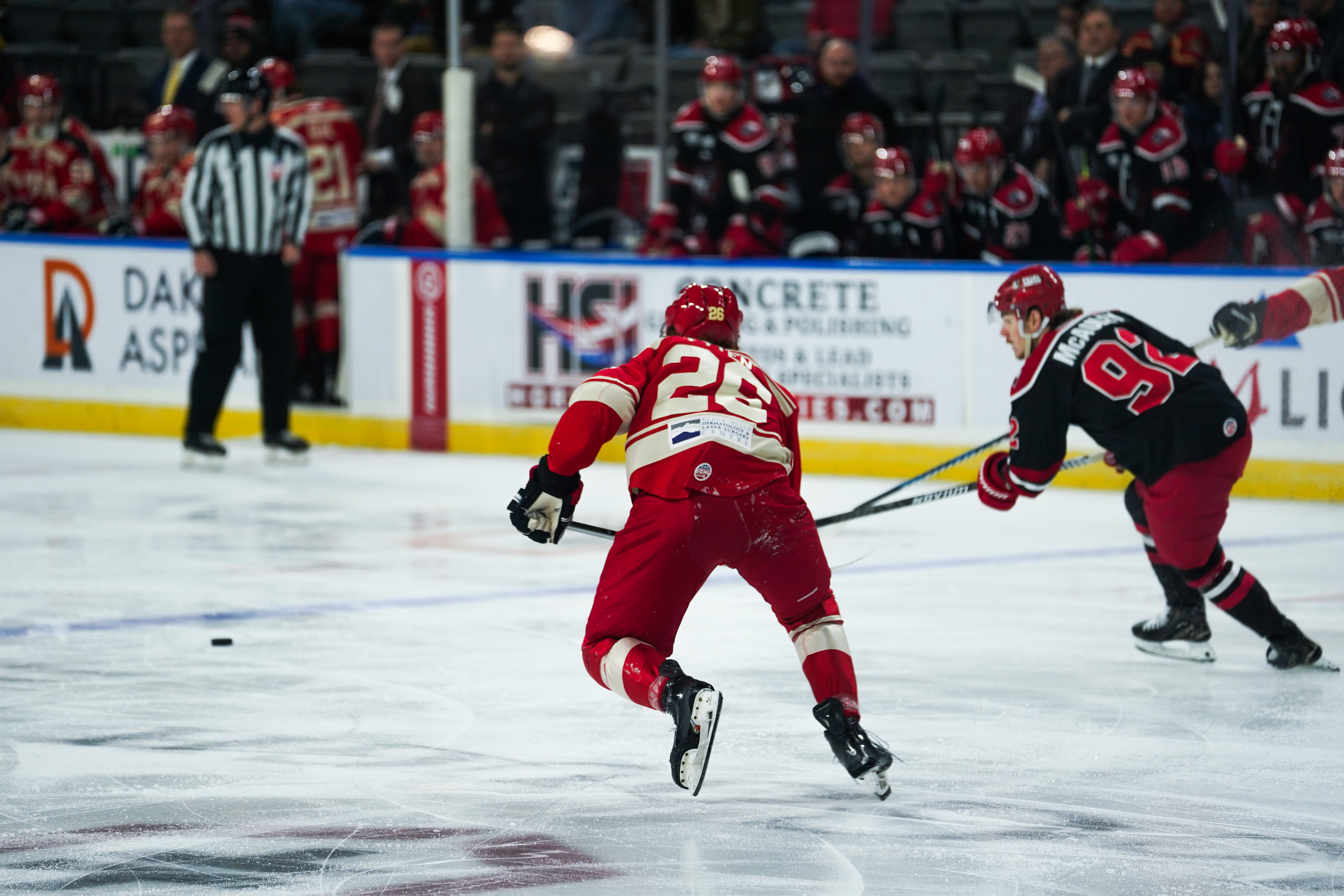![]() Allen Americans left wing Colby McAuley (right) races for the puck vs. the Rapid City Rush (Rapid City Rush) |