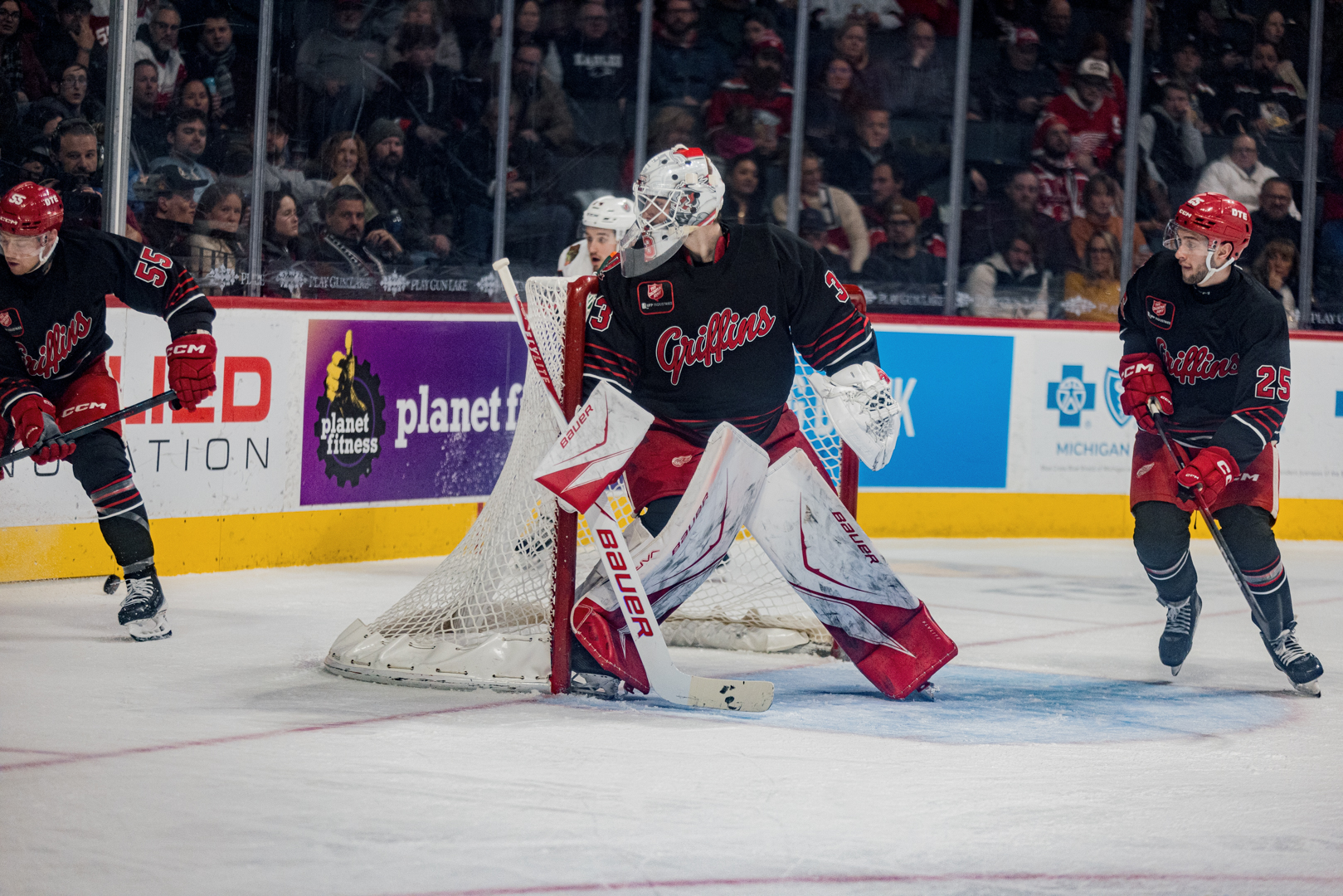 Grand Rapids Griffins' Ian Mitchell, Sebastian Cossa, and Ondřej Becher on game night