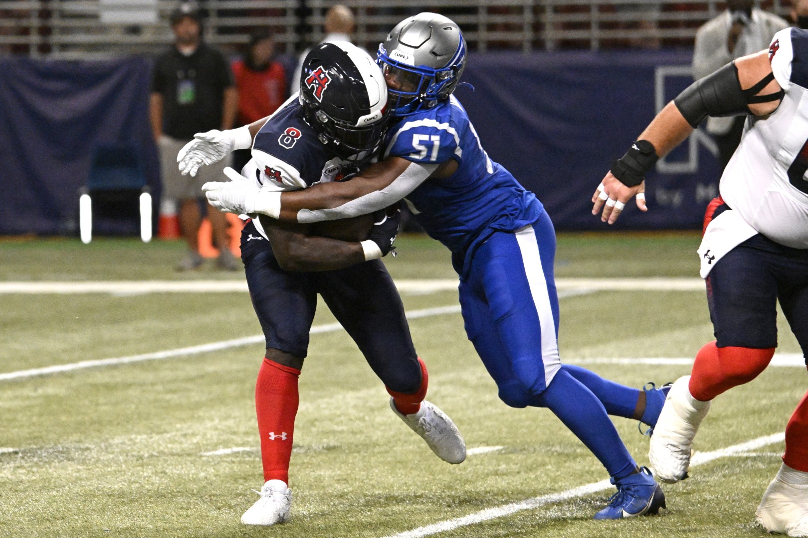 ![]() St. Louis Battlehawks linebacker Willie Harvey vs. the Houston Roughnecks |