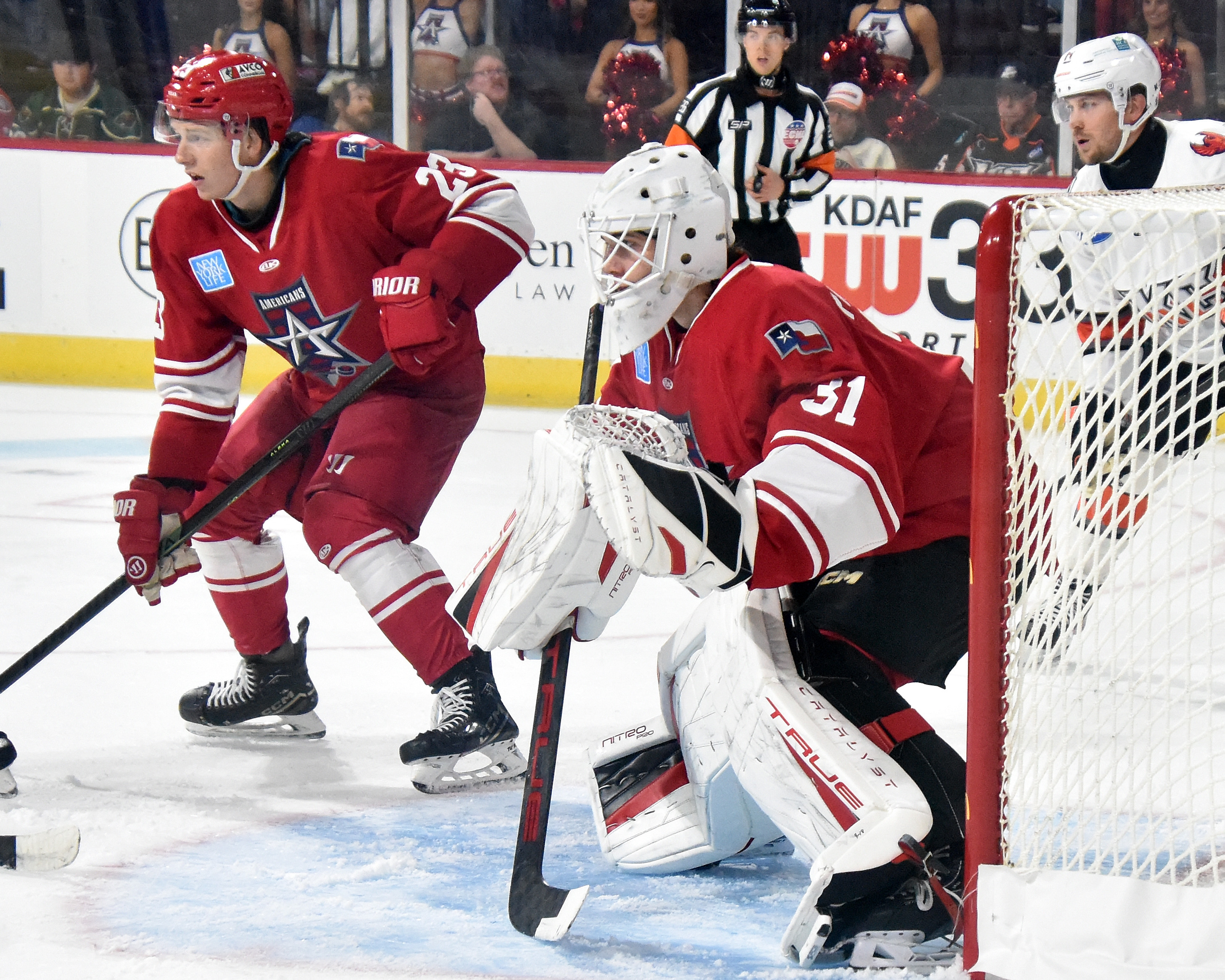 ![]() Allen Americans defenseman Sam Sedley and goaltender Jackson Parsons |