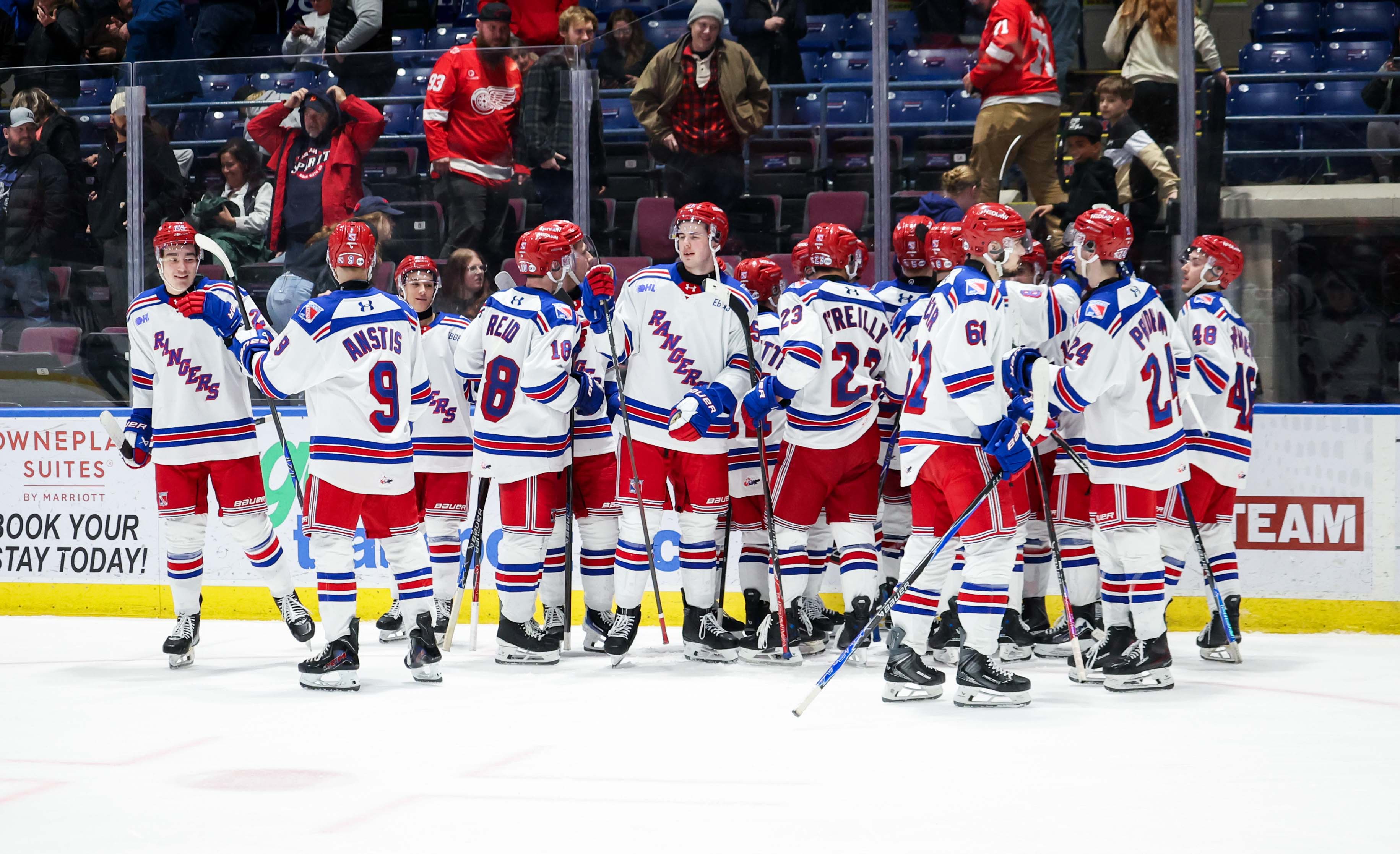 ![]() Kitchener Rangers exchange congratulations after a big win |
