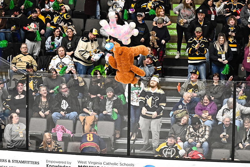 The 26th annual Teddy Bear Toss took place at WesBanco Arena on Saturday night, and fans didn't have to wait very long to start throwing their stuffed animals onto the ice. Matty De St. Phalle whipped a power play wrist shot into the top-left corner of the net at the 7:14 mark of the first period to ignite the toss. Early goals have been extremely common for the Nailers on Teddy Bear Toss Night both in recent seasons and all-time. This was the fourth straight season in which the fur went flying less than ten minutes into the contest. Historically, Wheeling has now netted the Teddy Bear Toss Goal during the first period 16 times, and 13 of those have taken place during the opening ten minutes. De St. Phalle's strike was the seventh fastest to produce the shower of stuffies, with the earliest goal coming just 2:19 into the game in 2018 from Zac Lynch.