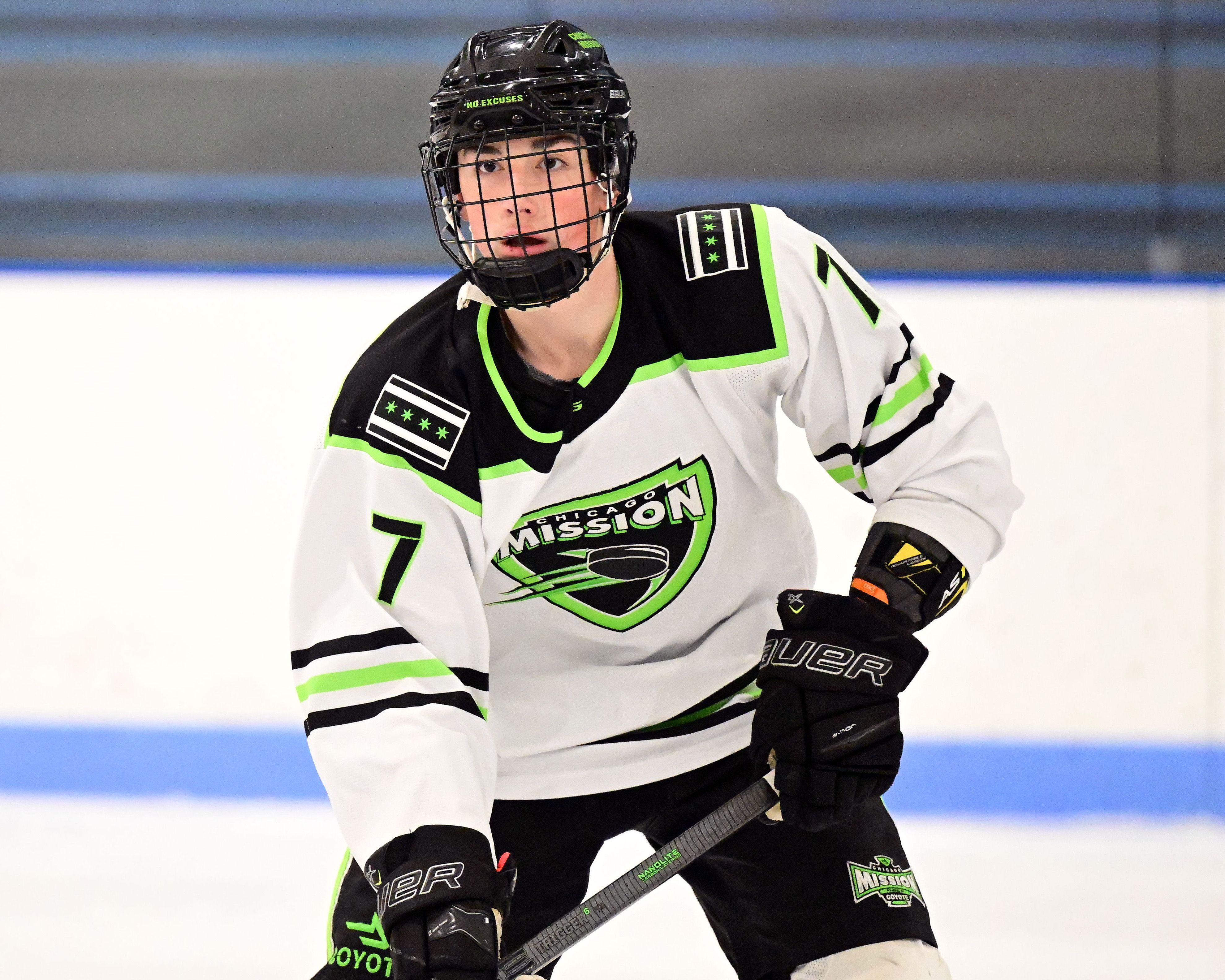 ![]() Defenceman Holden Carter with Chicago Mission (Dan Hickling) |