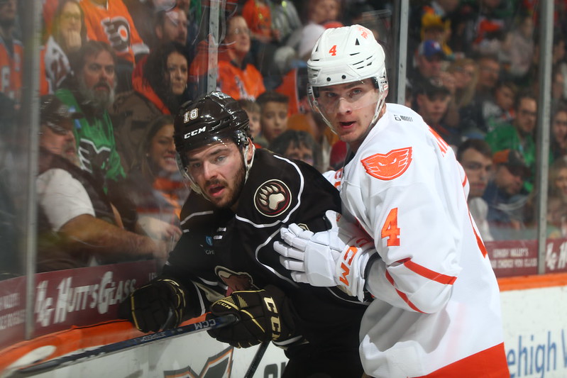![]() Hershey Bears' Garrett Pilon and Lehigh Valley Phantoms' Egor Zamula |