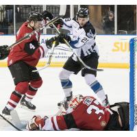 ![]() Idaho Steelheads fight for the puck in front of the Rapid City Rush net |
