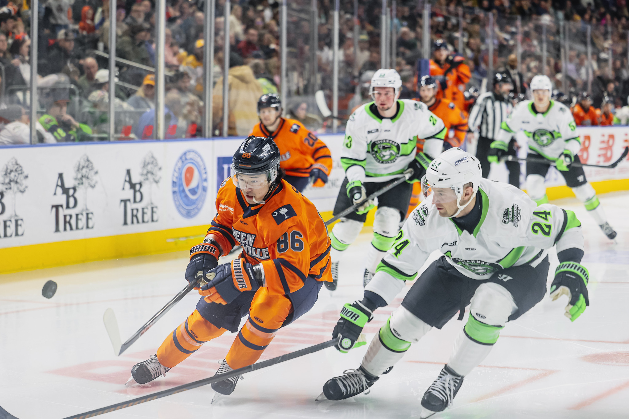 ![]() Greenville Swamp Rabbits forward Kenta Isogai (left) races for the puck vs. the Savannah Ghost Pirates |