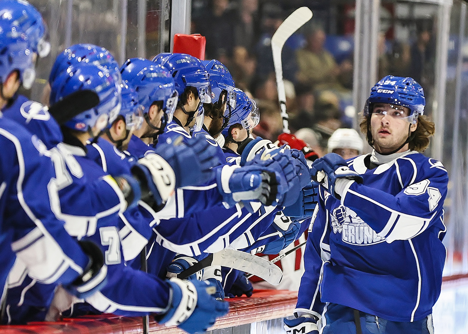 Syracuse Crunch center Conor Geekie receives congratulations from the bench