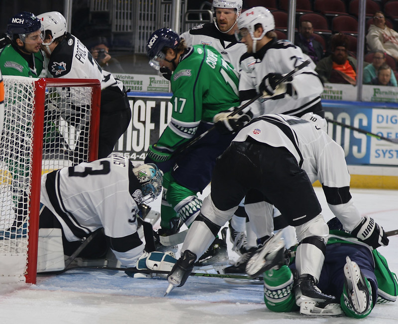 Florida Everblades forward Oliver Cooper fights for a goal against the Wichita Thunder