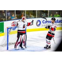 ![]() Adirondack Thunder goaltender Eamon McAdam celebrates with defenseman Kelly Summers |