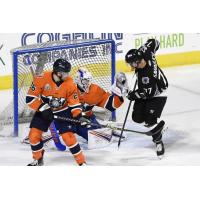 ![]() Worcester Railers goaltender Ken Appleby makes a stop while defenseman Jared Brandt stands ready |
